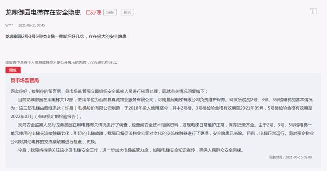 嚇人!濮陽這個小區(qū)的電梯故障頻出,到底咋回事? W*** 2021-06-11 07:45 龍鼎御園2號3號5號樓電梯一星期壞好幾次,存在極大的安全隱患 該留言中含有個人信息或其他不便公開展示的內容,